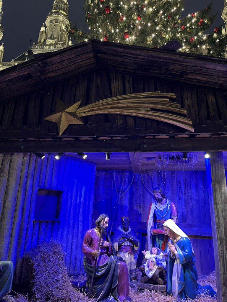 ラートハウスの前には巨大なもみの木があり、その下にはアッシジの聖フランチェスコが愛したクリッペ(聖家族のイエス様の馬小屋でのお誕生シーン)があります。